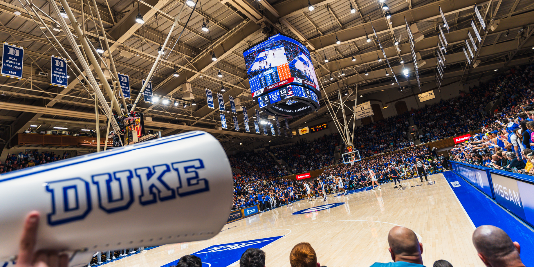 The new centerhung scoreboard at Cameron Indoor Stadium has 5.5 million pixels, a major upgrade from the previous board's 415,000. Duke's creative teams use the new video board to engage fans, provide high-definition replays, and improve sightlines. The project aimed to balance modern technology with the historic feel of Cameron Indoor Stadium.