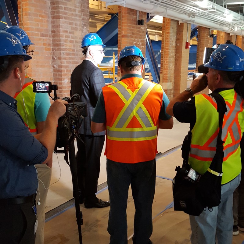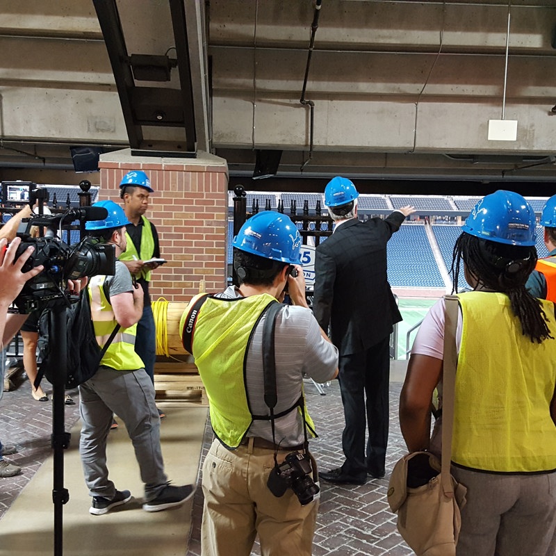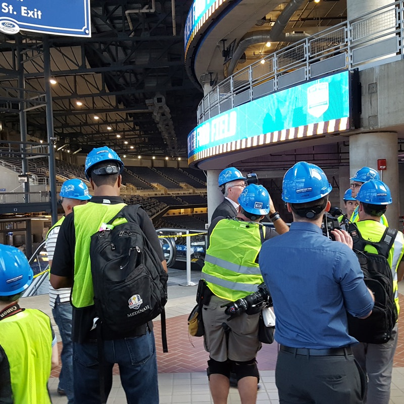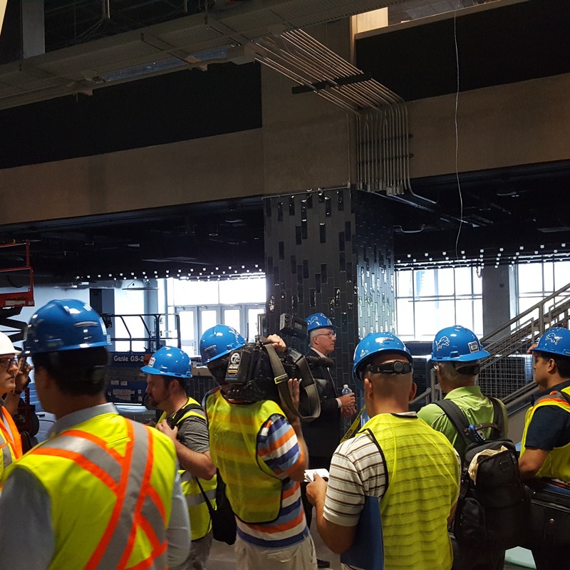 Daktronics Sales Representative Daryl Mihal and I followed along with the tour to provide details of the LED displays for media members. Daryl was available for follow up interviews after the tour with fact sheets listing all the new displays along with interesting facts relating to the Detroit area to make them easier for people to relate.