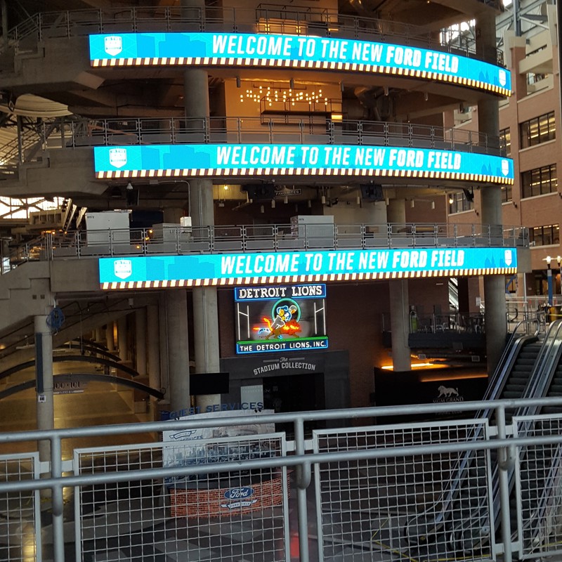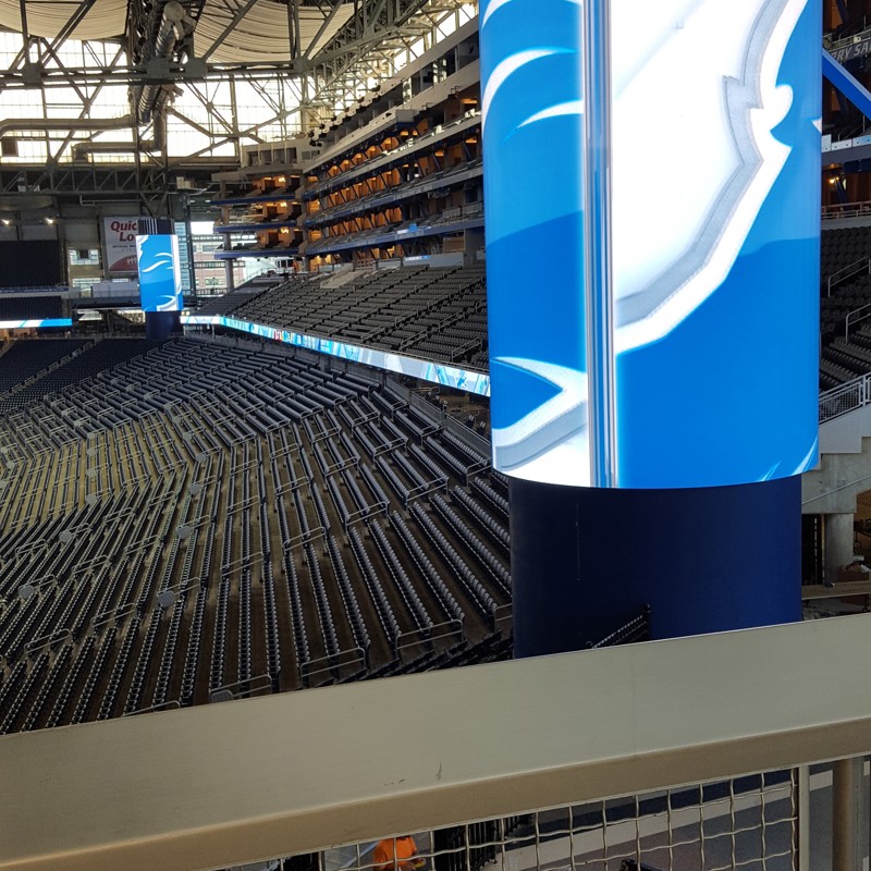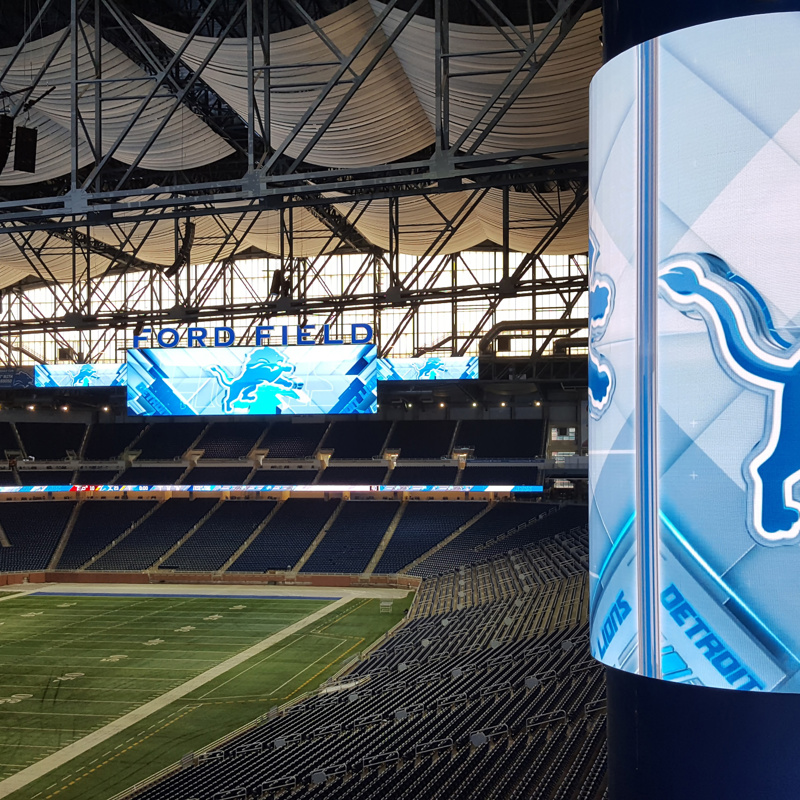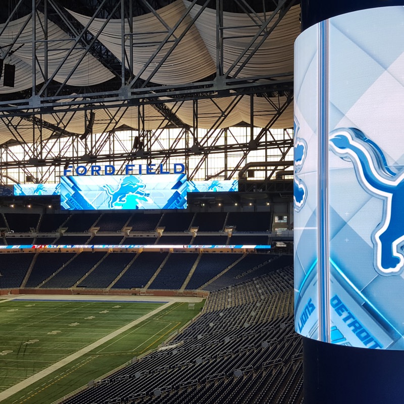 Two super columns located in two corners of the venue are curved and wrap the full 360 degrees around support columns to provide a digital canvas where there once was only fixed signage. These are unique to Ford Field and will provide an identifying landmark whenever seen on television broadcasts.