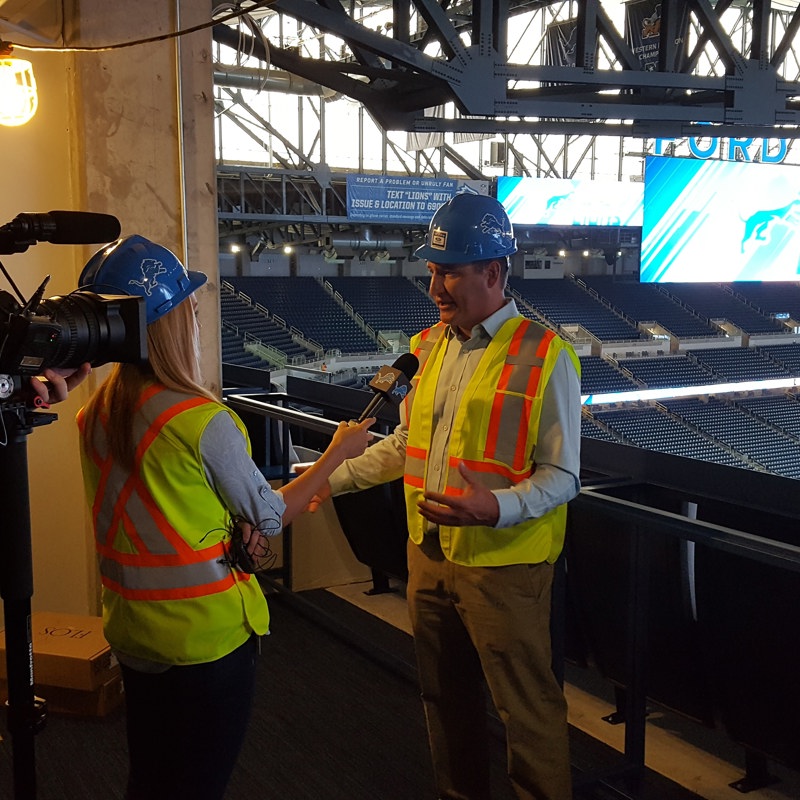 Highlights from Lions games and the logo animation continued to play on the displays as Rod Wood answered questions with the end zone displays in the background. Shortly after, Daryl took an interview with the Lions website reporter in the neighboring suite to share further information about Daktronics involvement with the project.