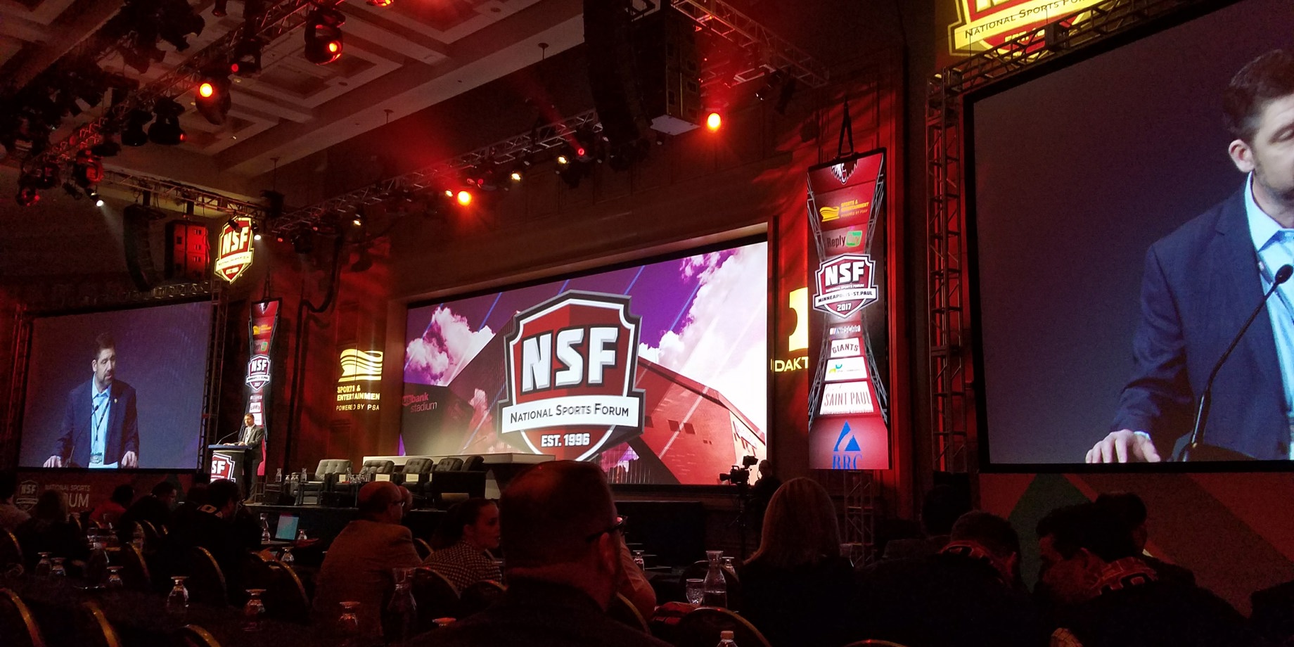 Last Sunday morning, I packed up my car and hit the road for about a 3 ½ hour drive towards the city of Minneapolis, MN. My destination – the National Sports Forum 2017 at the Minneapolis Convention Center. I arrived at the hotel around 2 pm and was able to check in a little early. After getting everything unpacked in my room, I headed down to pick up my NSF packet which included a program, attendee list, and my sponsor badge. I peeked into the main ballroom to see all the hard work our demo group had been doing for the past day and a half. We had 2 – 4mm LED display columns on both sides of the “Daktronics Stage” and a 6mm podium display. We also had a scoreboard/timer in the back of the room facing the stage which would be used for each session’s moderator to know how much time they had left before they had to wrap it up.