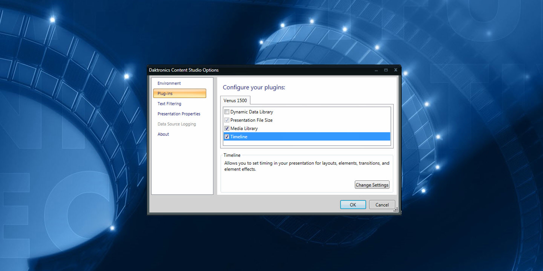 - Click on Plug-ins, found in the Daktronics Content Studio Options window and put a check mark in the checkbox next to Timeline under Configure your Plugins.