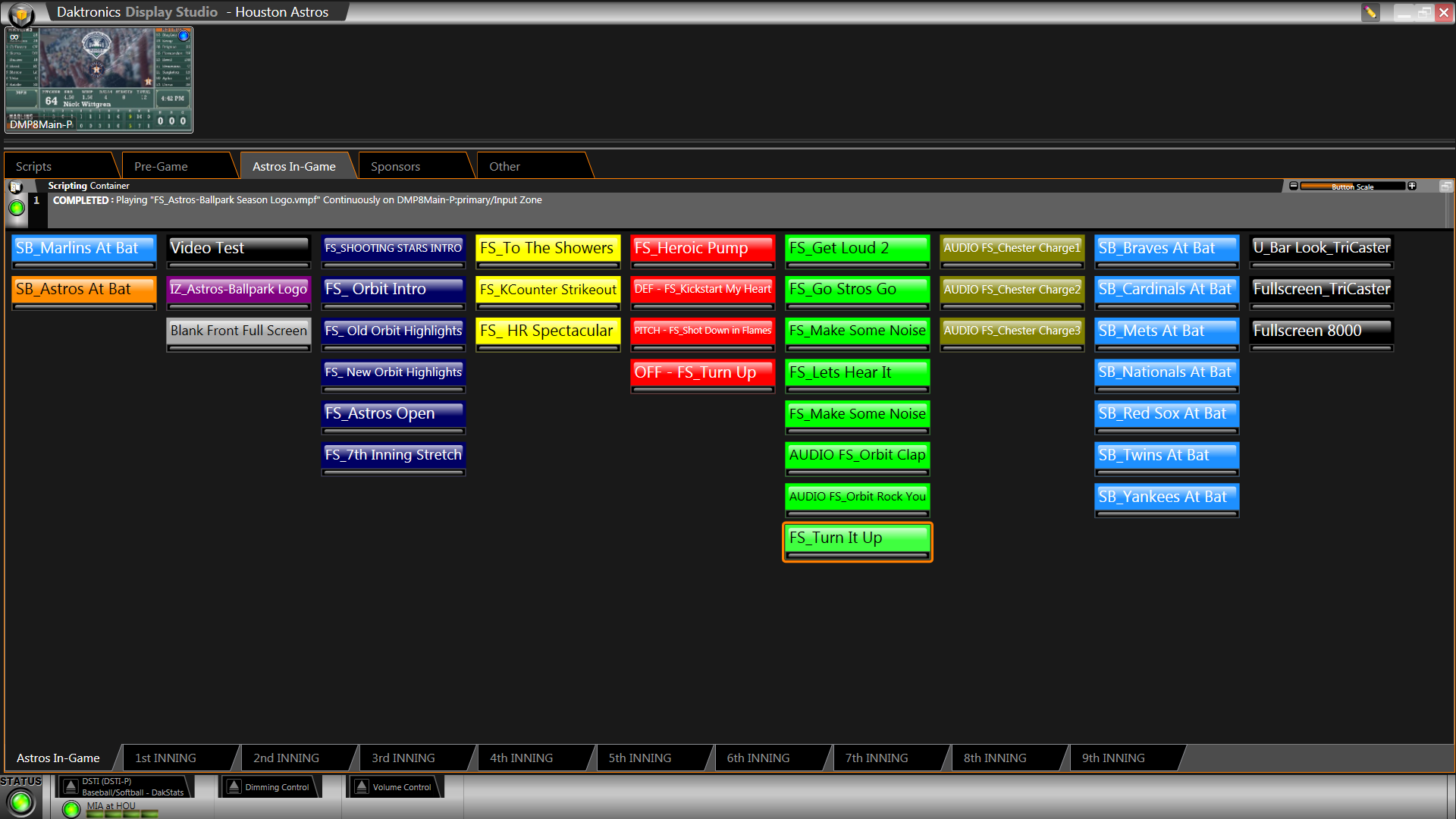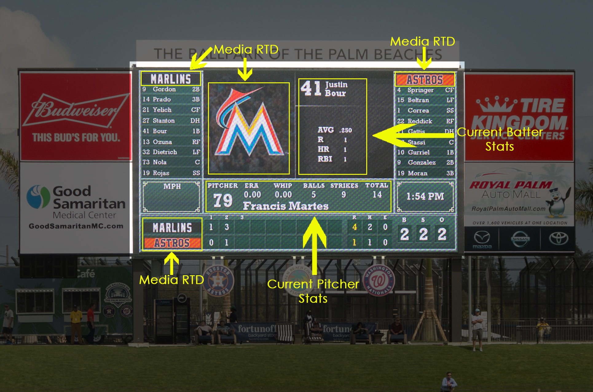 To assist in providing a consistently top notch, yet simply operated production, Media RTD was used in many different forms. From team logos, to headshots, to marking the current batter in the lineup, Media RTD was used all over. But this presented some challenges with the teams wanting different looks during their games. The Nationals wanting to use a team’s logo, and the Astros wanting to use the word mark instead, we had to find different data fields that could be pulled, and label the content accordingly to allow this. On top of using Media RTD to make life easier, many stats were also pulled based on the current batter and current pitcher in DakStat. This will allow the stats to update automatically when a new player comes in to the game. Once these sorts of details were worked out, it doesn’t matter who operates Show Control for the day, all logos, headshots, etc…. will display automatically without having to be updated before each game, and without having to make a graphic and a button for every player on a LONG Spring Training roster.
