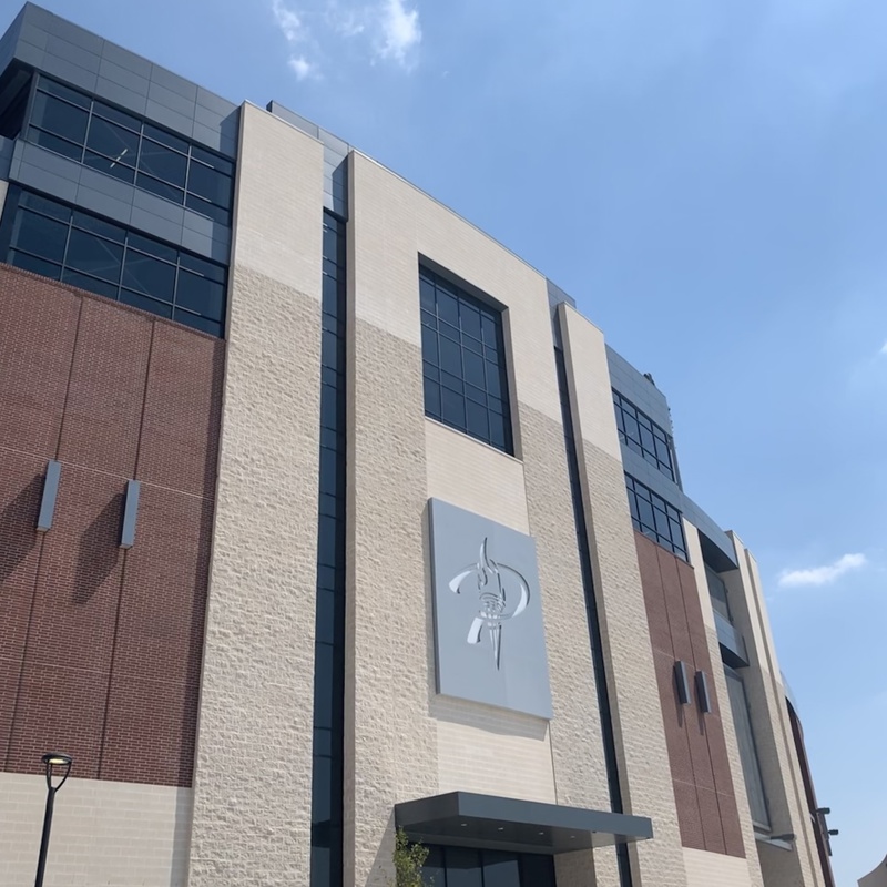 The turf stadium features 12,000 seats. The centerpiece of the arena is the 57’ x 67’ Daktronics video display scoreboard, a digital audio facade that synchronizes audio and video, and LED ribbon board displays. All told, there are more than 1.4 million video pixels in the stadium, covering over 3,000 square feet – more than any other high school in Texas.