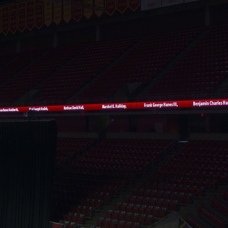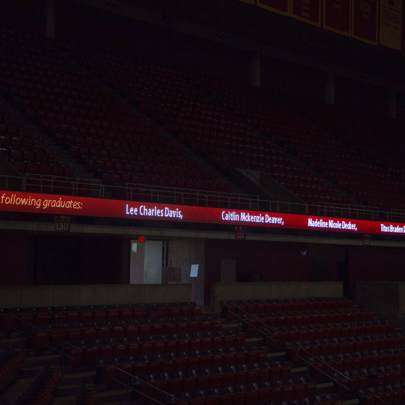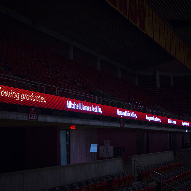 Bryan Perry, Daktronics event producer at Iowa State University, displays around 2,500 names during graduation. DDM is used to page 10 names every 15-20 seconds on their ribbon displays. The Registrar’s office provides the lists of graduate names divided into each college- College of Business, College of Design, etc. During graduation, he copies the lists into DDM to page through the appropriate names when they bring each college on stage to get their diploma covers.