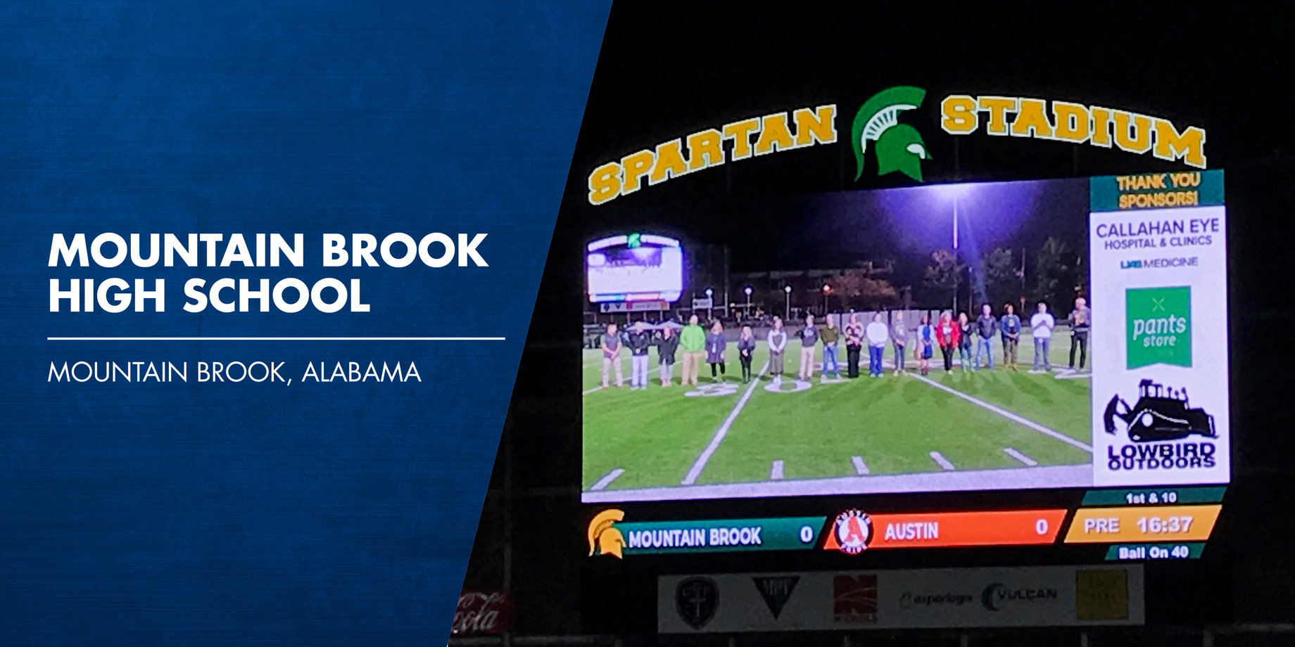 Mountain Brook High School lies in a suburb of Birmingham, Alabama. They have about a thousand students and a very supportive network of parents and businesses. So when the school installed a new Daktronics video board on their football field, they successfully found sponsors to help them pay for it – and add funds to team budgets and the school as a whole.