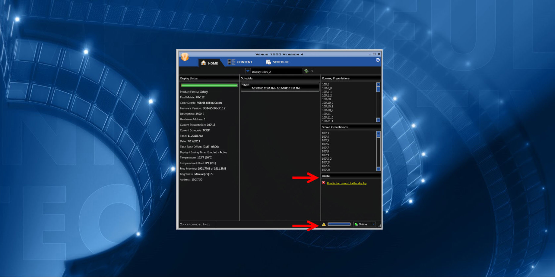 Seriously! Right after you Publish To Display, double-click on the little blue Progress Bar located on the bottom right corner of Venus 1500 V4, to the left of the Online/Offline Status Indicator. This will open up a larger Progress Dialog window that will show you the progress of each message and your schedule as they are sent out to the display.