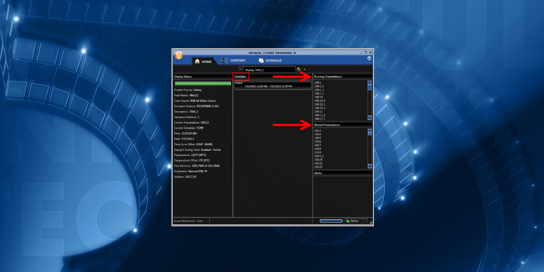 Welcome to our third overall and second-to-last post about the Venus 1500 V4 Home Tab! We previously went over the Online/Offline Status Indicator, as well as Alerts and the Progress Bar. This time around, we will cover Running Presentations, Stored Presentations, and Scheduled Playlists.