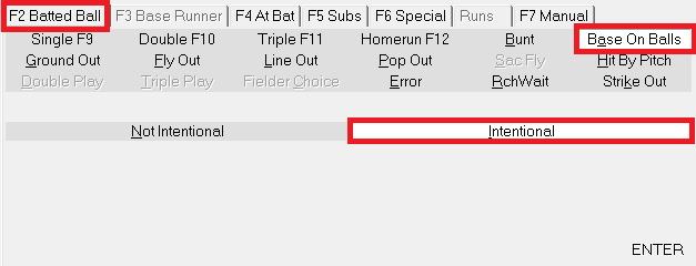 Rather than the pitcher throwing four pitches to walk a batter, a hand signal is given by the defensive’s teams manager. To properly input this play in DakStats, users should use the Base on Balls option (located on the Batted Ball tab), then select Intentional. This will advance the batter without affecting the pitch count.