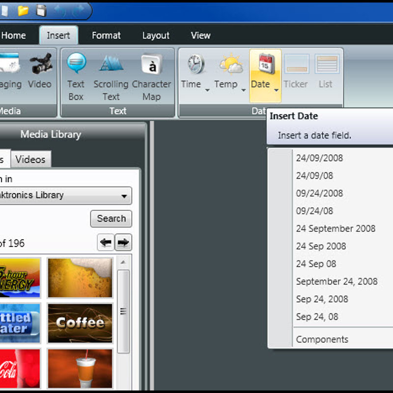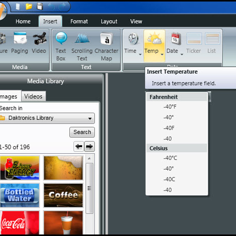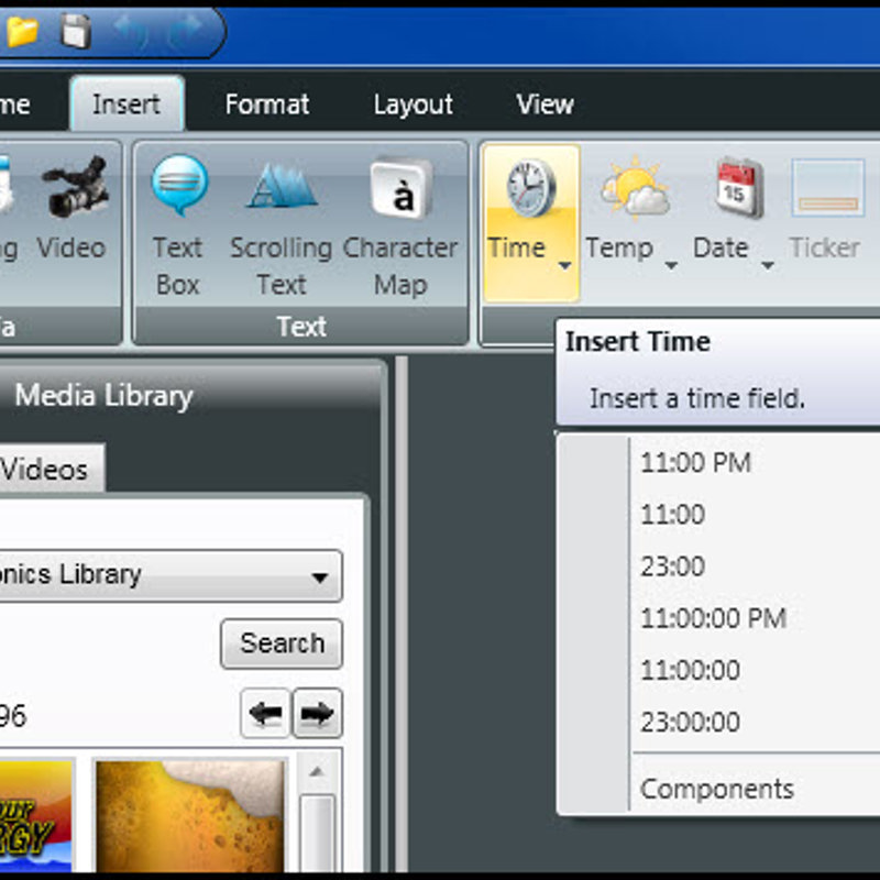 The Insert Tab does just what its name implies. It allows you to insert pictures and videos, create text boxes and scrolling text, as well as produce time, temp and date messages, among other things. Let’s take a closer look, shall we?