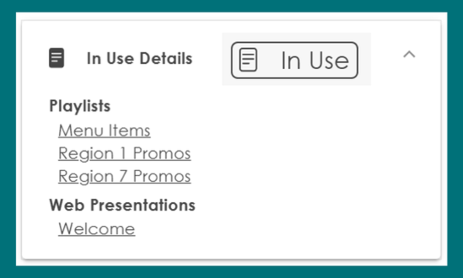 Selecting the file reveals “In Use Details” including the playlist or Web Presentation the file is being used in and a link to the playlist or Web Presentation.