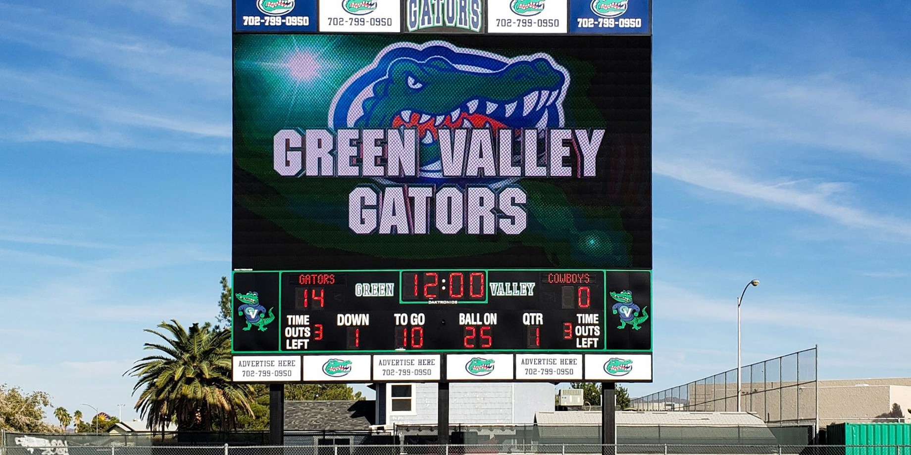 “Green Valley High School and the GVHS Alumni Foundation had a big vision when upgrading their football display.,” said Brandy Chenoweth, Daktronics Nevada sales representative. “The Gator pride is evident in Henderson and GVHS wanted their stadium to serve as a community centerpiece, while also giving the school increased opportunities to highlight the accolades of their student body.”
