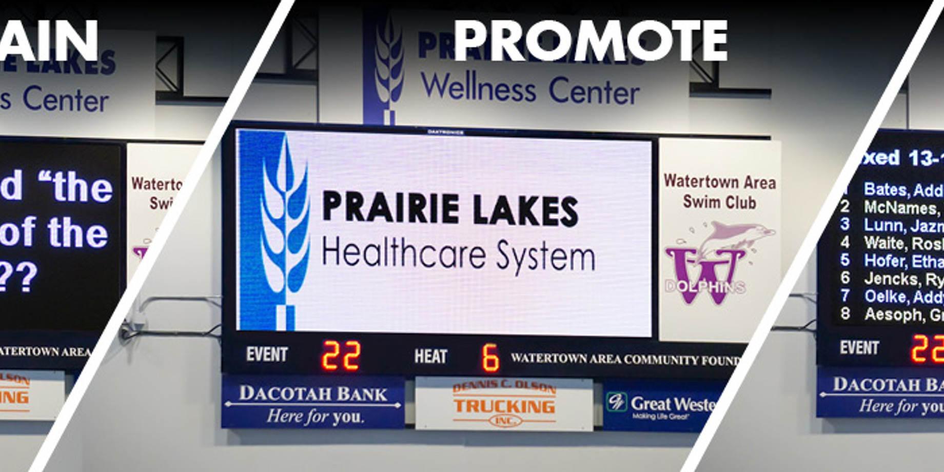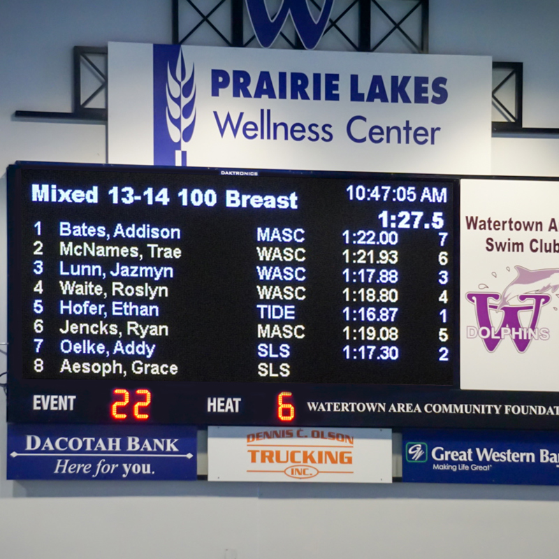 Going to Watertown, SD, for a swim meet is entertaining for swimmers and their fans. Of course, the races themselves are the main attraction, but Watertown Area Swim Club (WASC) keeps people engaged and entertained with their Daktronics 10mm scoreboard, too.
