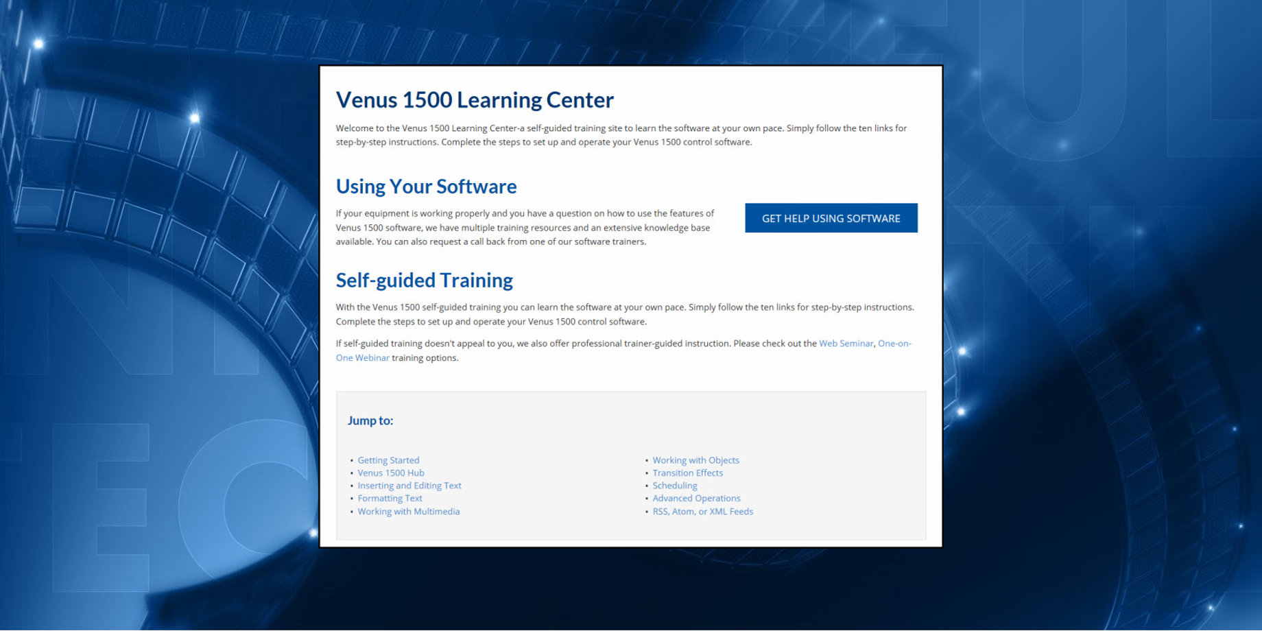 Now that you know how to get to the Venus 1500 Learning Center, let’s look at how to use it! Choose from ten sections, with the most basic training materials starting on the top of the page. The farther down the page you scroll, the more advanced the training materials will become.
