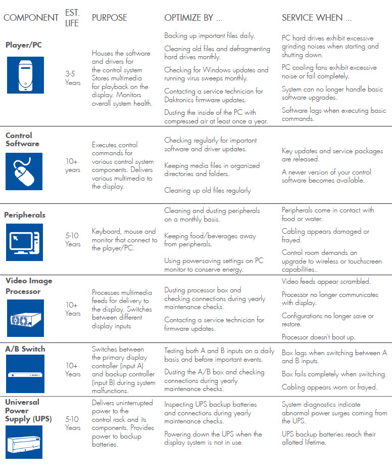 As the creative engine of your display system, control components play an equally important role in obtaining an extended system life. Most control components, such as video processors and switchers, are engineered to last a lifetime. PC-based components such as players and hard drives, need to be upgraded every 3-5 years to keep up with new software and content demands.