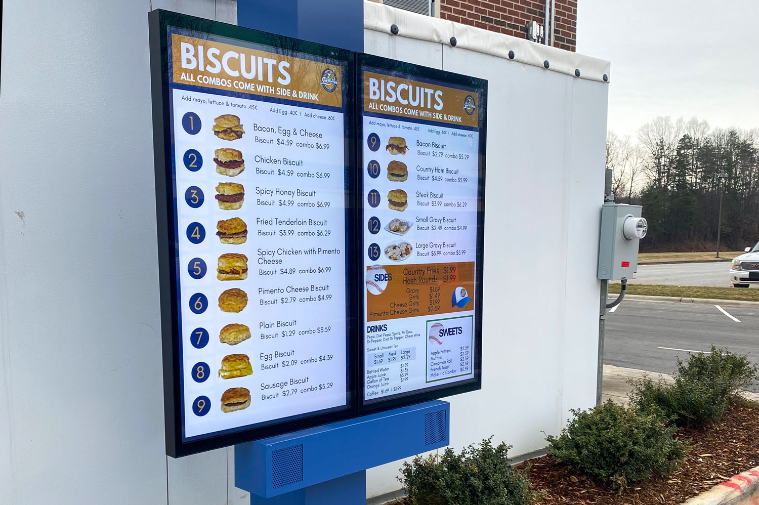 Provide a consistent digital experience outside by replacing static menu boards; using pictures and graphics at your drive-thru to increase basket size and order efficiency.
