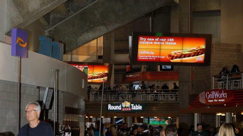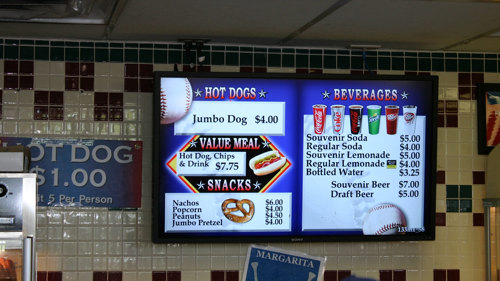 Dynamic digital content in concessions and team retail generates more spending per visitor, decreases perceived wait times, and increases fan enjoyment. Digital menus show promotional video and live action right alongside the concession menu.