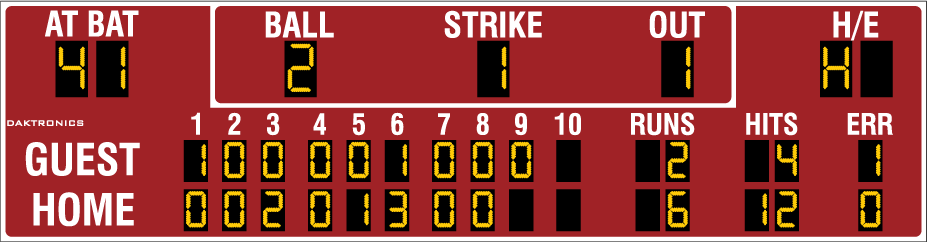 HITS to 99 and ERR (errors) to nine for each team, AT BAT to 99, BALL to three, STRIKE to two, OUT to two and H/E (hit or error) with field position number for the error. Scoreboard can show TIME or PITCH COUNT instead of AT BAT, as well as AT BAT or PITCH COUNT in place of H/E.
