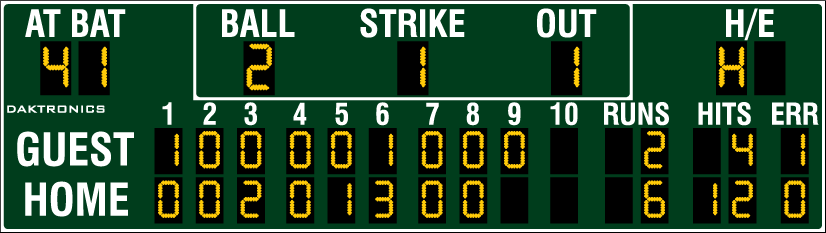 HITS to 99 and ERR (errors) to nine for each team, AT BAT to 99, BALL to three, STRIKE to two, OUT to two and H/E (hit or error) with field position number for the error. Scoreboard can show TIME or PITCH COUNT instead of AT BAT, as well as AT BAT or PITCH COUNT in place of H/E.