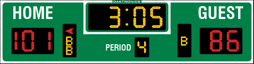 and indicates possession and bonus. Scoreboard can also score volleyball and wrestling. When period time is less than one