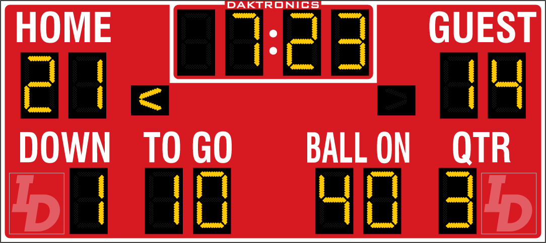 This outdoor LED football scoreboard displays period time to 99:59, HOME and GUEST scores to 99 and DOWN/TO GO/