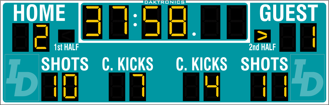 with SHOTS (or S.O.G.) and C. KICKS (or SAVES) to 99 for both teams. Arrows indicate the current HALF. Track running time displays to 1/10 of a second, while lead split and finish times display to 1/100 of a second. Scoreboard comes standard with track captions on changeable panels. When period time is less than one minute, the scoreboard displays time to 1/10 of a second.