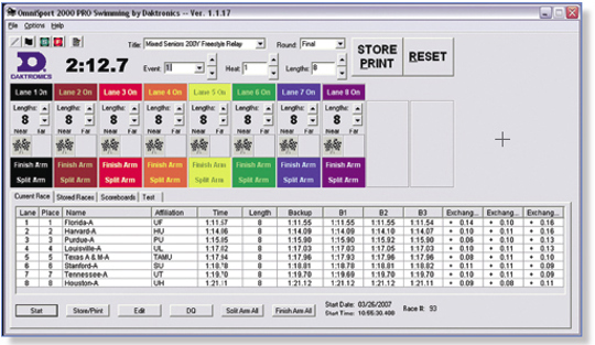Daktronics Pro Swimming software interfaces to OmniSport® 2000 timing consoles via serial or Ethernet connection to gather touchpad, button, relay exchange, and start reaction times. The software also interfaces with results programs like Hy-Tek MEET MANAGER for Event Order and start lists with competitor names. The software integrates with Daktronics aquatics scoreboards and message displays to show Real-Time Data (RTD).