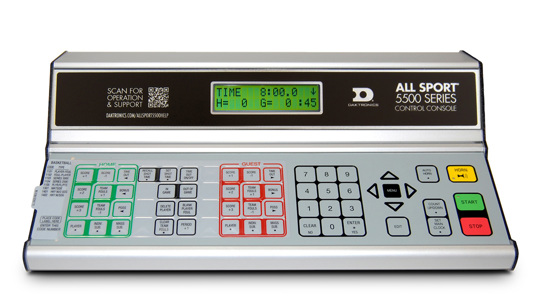 The All Sport® 5500 series controllers are designed to control ColorSmart® scoreboards and ColorSmart-compatible statistics displays and timers. The console is most often used for basketball, but can also score volleyball and wrestling.