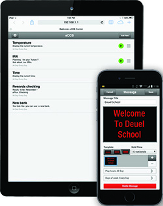 Galaxy eCCB LED displays show text-based messages in red and provide the ability to post messages using a Wi-Fi ready device. The control interface allows for the creation and scheduling of up to 18 messages with no need to download software.