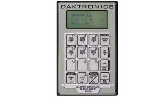 The RC-100 console is a 900 MHz wireless device that controls small scoreboards and timing displays. Typically used for baseball and tennis scoring, the device can also score judged diving and rodeo events when connected to an OmniSport 2000 timing console. The handheld unit features a rechargeable Ni-MH battery for 8-10 hours of operation on a full charge.