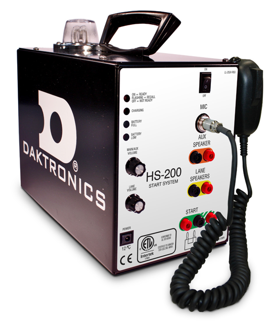 Horn starts, lane speakers and other start system support are available. The HS-200 horn start is a portable starting solution for aquatics and track. Signal the start of a race with a distinct start tone and simultaneous strobe flash. Included microphone makes announcements, sends start/recall signals and changes device settings. Internal battery provides 15 hours of use on full charge. A wireless microphone option is available.