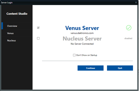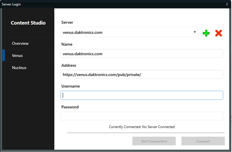 - When the Content Studio Login box appears enter your User Name and Password. These are the same as your Venus Control Suite Login information