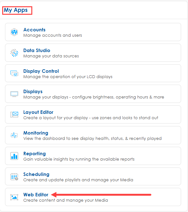 - Select the Web Editor tab under My Apps in the Launchpad or from the Venus Control Suite menu.