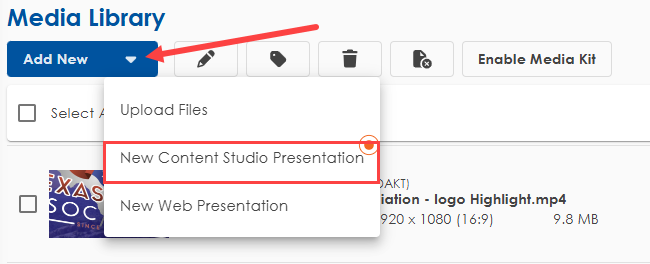 - Under Media Library click on the drop-down arrow and select New Content Studio Presentation