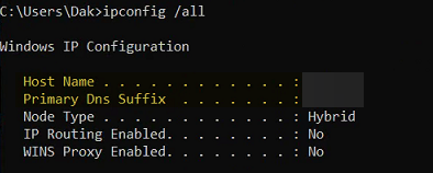 - The "ipconfig /all" command from command prompt can be used to find both of these values as shown below, reference Not able to associate DMP, not using DNS suffix if needed.