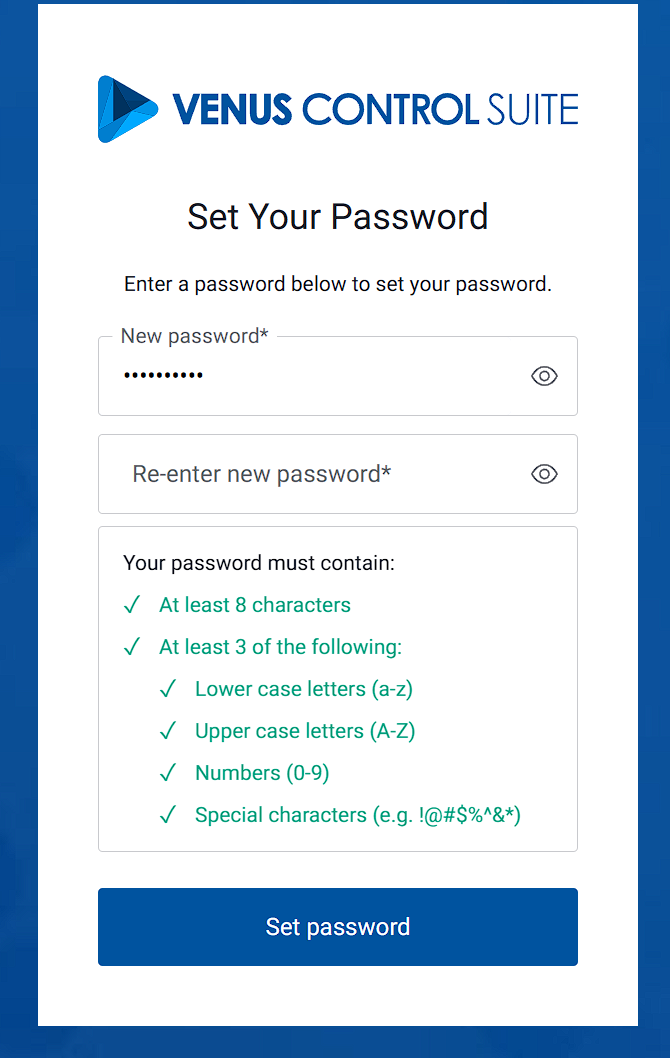 Below are a few tips for achieving a highly secure password for your Venus Control Suite login.