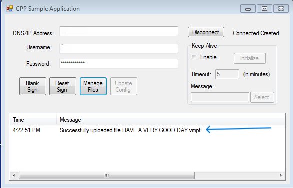 - Close the SelectVmplForm window and note in the CPP Sample Application window that the message uploaded successfully.