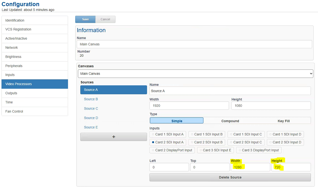 - For VPs: If you change the "Input Format" of an input on an "Input" card to a different frame size (1080 vs 720), proceed to the following section below: Change the Video Processing Engine Configs.