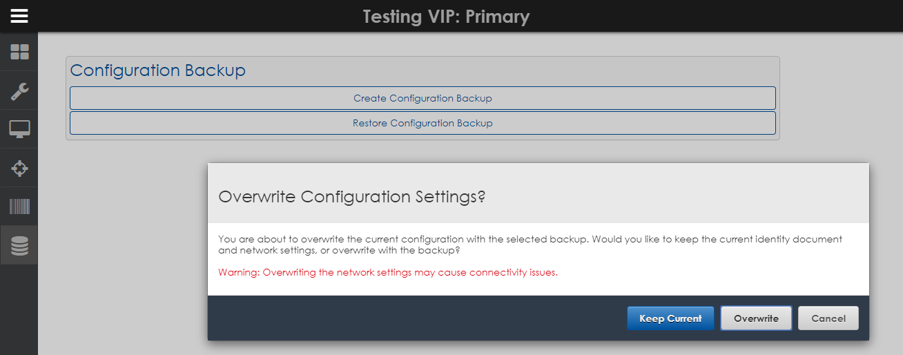 If restoring a configuration from the primary to the backup processor, choose Keep Current and make any other desired changes using the UX. This keep the identity and network settings as they are and replace all the other configuration information.