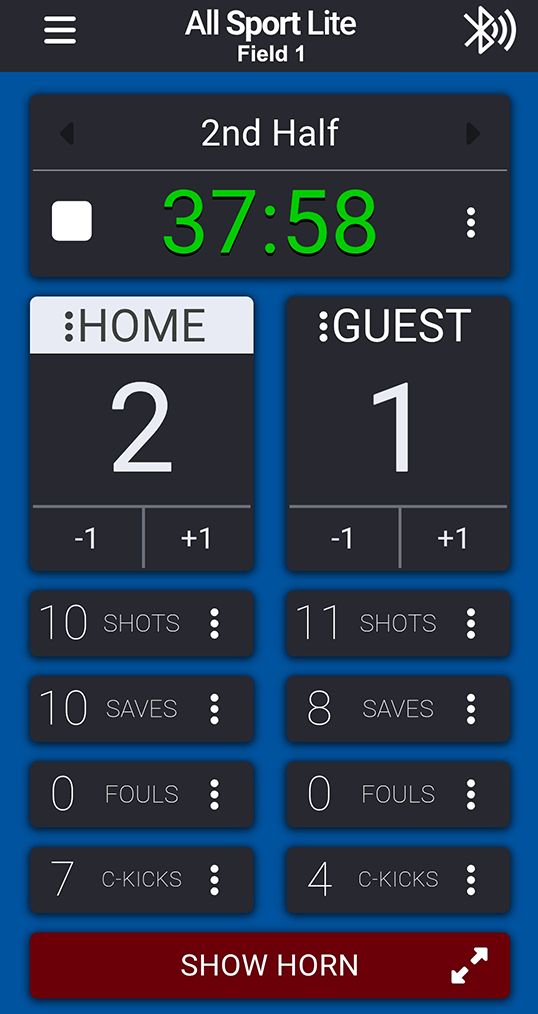 - Tap SHOTS, SAVES, FOULS, or C-KICKS to increase the stat for the appropriate team. Tap the settings button (