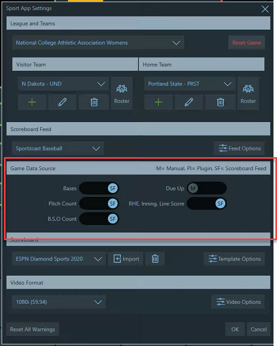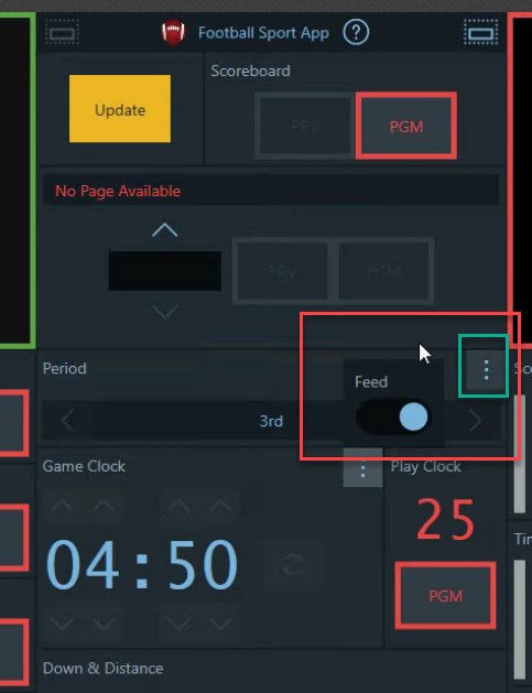 - Options for checking the source from feed varies in location from sport to sport. Some have the 3 dots by the field other apps such as baseball have options in the setting gear for data fields to come from plug in scoreboard feed or manual. To confirm the clock, score, period and other options are set to auto instead of manual. See examples below
