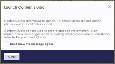 - "Content Studio attempted to launch. If Content Studio did not launch please contact Daktronics support" error is present.