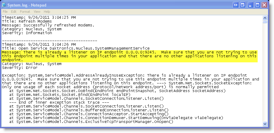 - Exception: System.ServiceModel.AddressAlreadyInUseException: There is already a listener on IP endpoint 0.0.0.0:9245. This could happen if there is another application already listening on this endpoint or if you have multiple service endpoints in your service host with the same IP endpoint but with incompatible binding configurations. ---> System.Net.Sockets.SocketException: Only one usage of each socket address (protocol/network address/port) is normally permitted