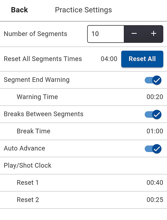 9. Tap Back when finished setting up the practice session.