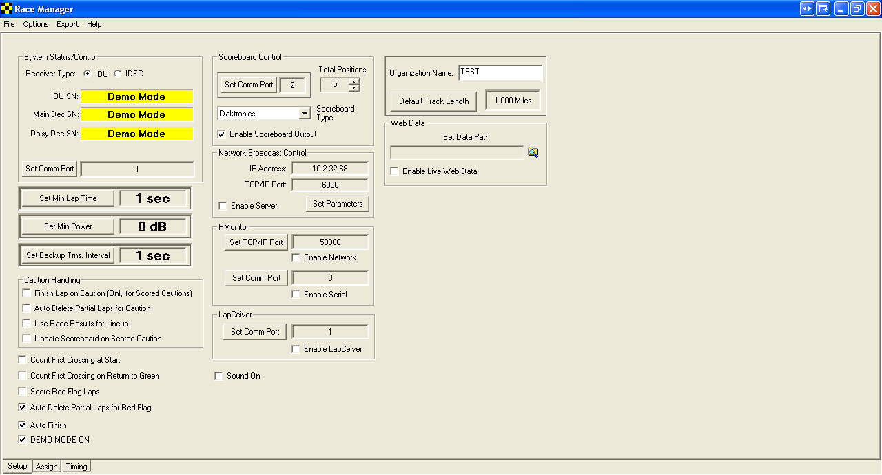- In the setup tab under Scoreboard Control set comport, Total Positions, Daktronics as a scoreboard Type, and Check Enable.