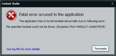 - "Fatal error occurred in the application. The application has to be terminated abnormally due to the following error: The specified module could not be found. (Exception from HRESULT: 0x8007007E)."