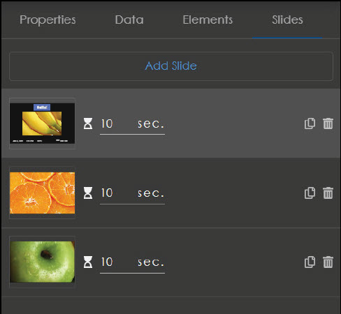 The Slides tab lists all slides in a presentation. The slides of a presentation can be arranged in the desired order by dragging and dropping the slide within the list. The duration of each of the slides can be set by clicking the duration timer and setting an appropriate time.