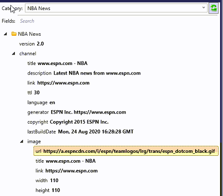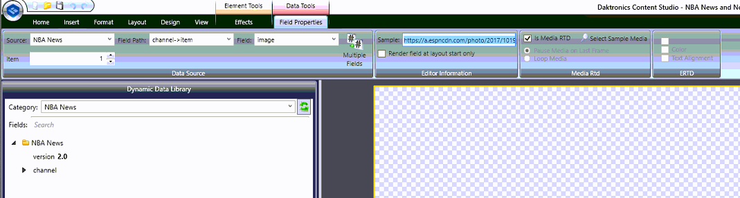 - Choose your Category from the Dynamic Data Library on the left hand side of Content Studio (i.e. the feed you created in Data Studio – in our example, NBA News)