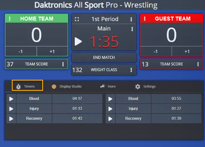 In the event of a Blood, Injury or Recovery, stop the main clock and select the play button for the appropriate timer. This can apply to both teams simultaneously.