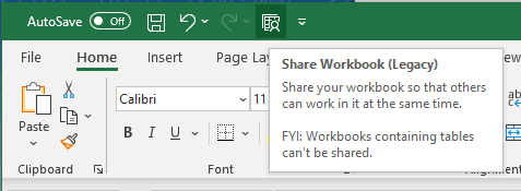 - Enable shared workbook see: About the shared workbook feature ("Shared Workbooks" is an older feature that allows you to collaborate on a workbook with multiple people. )
